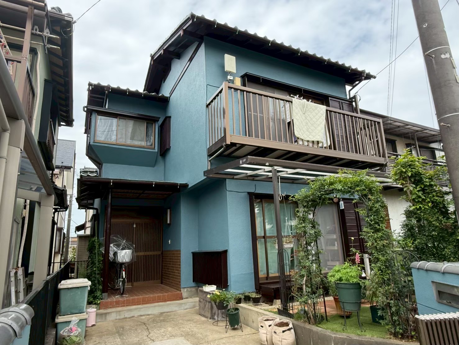 また、外壁塗装に加えて、面格子や木製サッシ、濡れ縁、門塀などの付帯部も外壁と同色に統一し、